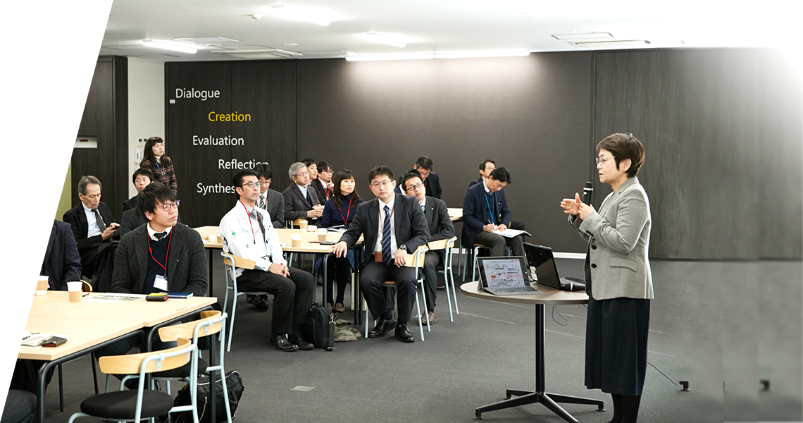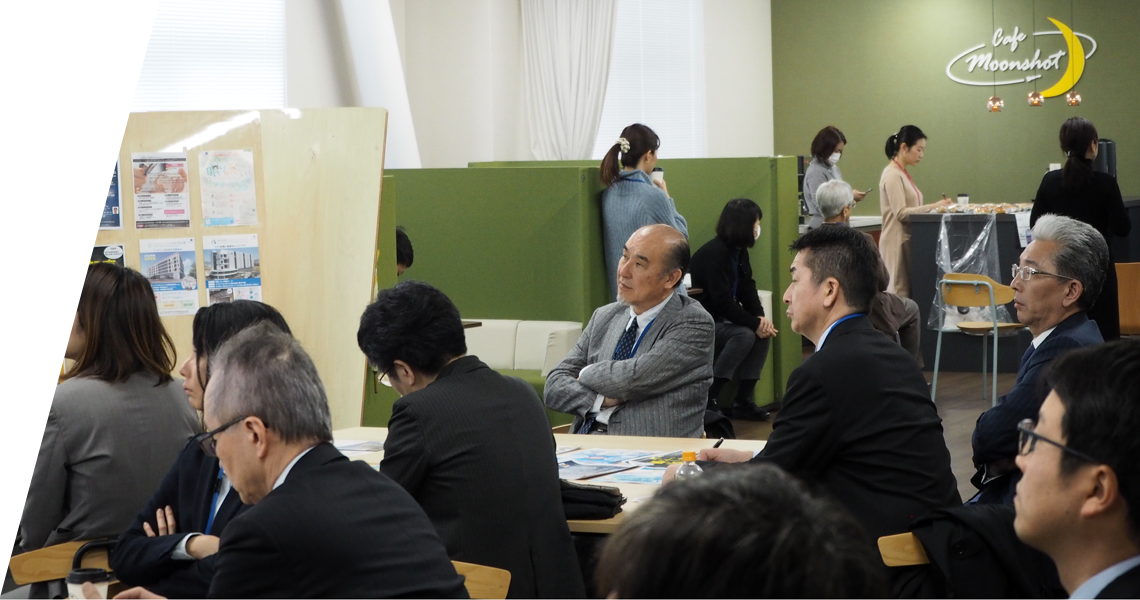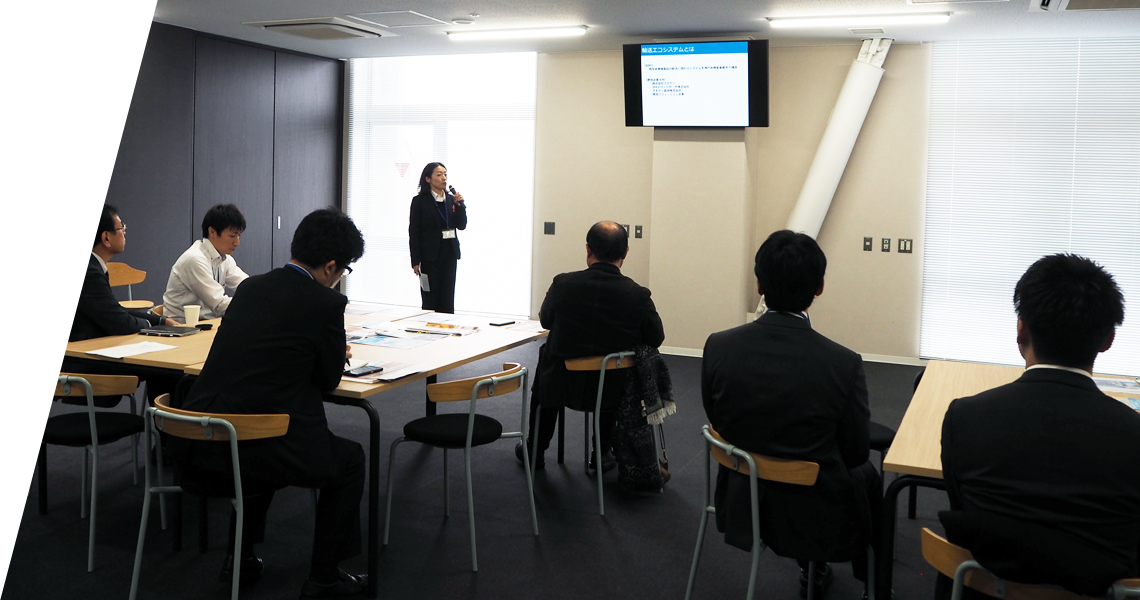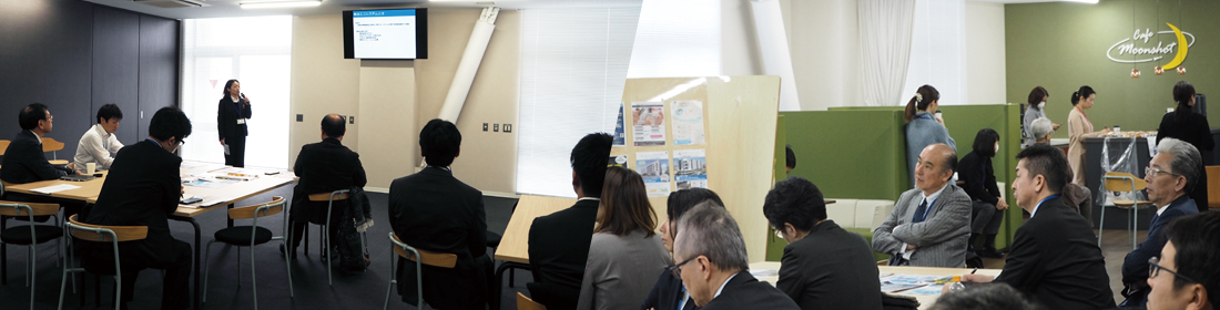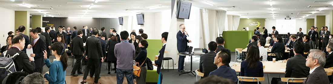 理化学研究所 融合連携イノベーション推進棟(IIB)で随時開催。進出企業・団体、大学に所属する人たちが、軽食を取りながら交流やシーズ技術紹介を行える場となっています。講演を聞く人がいたり、横のスペースで会話をする人がいたり、自由形式の異業種交流会です。