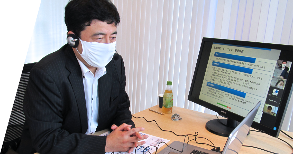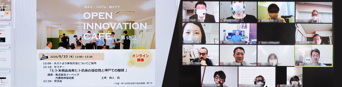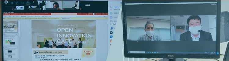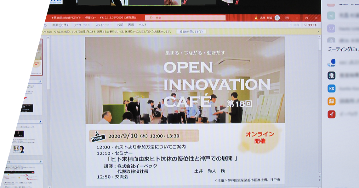 コロナ禍において、初のオンライン開催となった今回のオープンイノベーションカフェ。新型コロナ治療薬開発に必要な抗ウイルス抗体の作製等で注目されている企業の事業紹介が行われました。